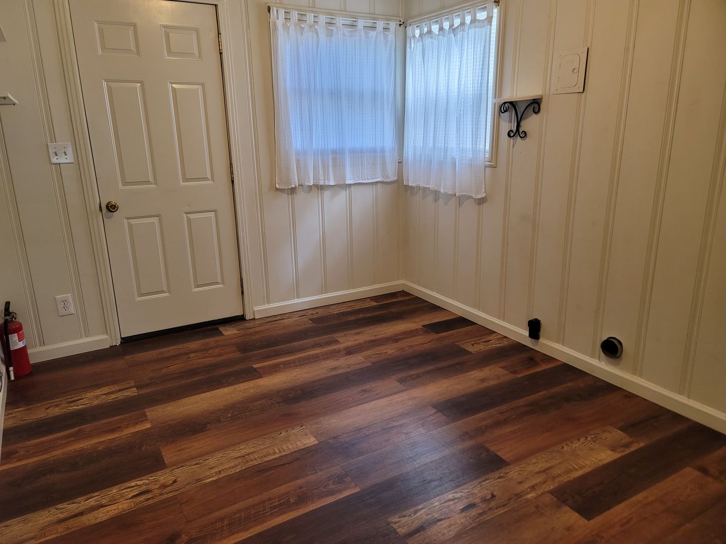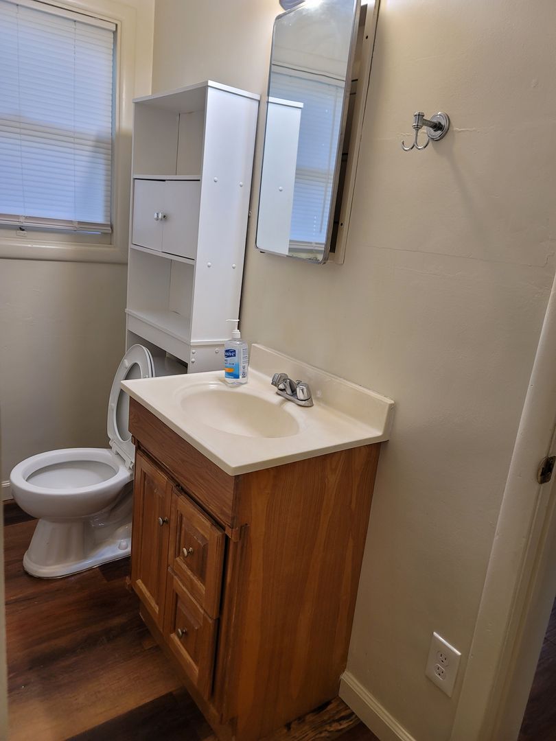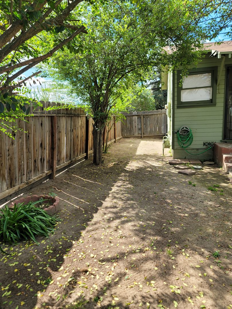 Cottage style home, 1/1, some drapes/blinds,window cooler, kitchen with gas stove, refrigerator, built in corner hutch, lvp plank flooring, , cozy back yard, no garage but shared storage.